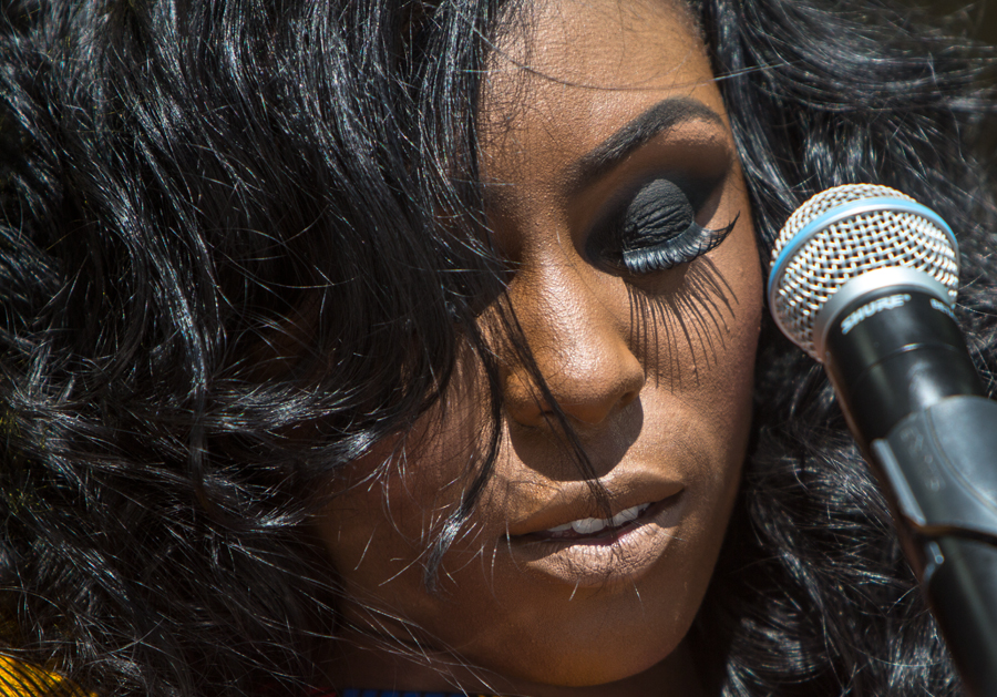 Next out was Laura Mvula. I photographed her at Oya last year with the sun in her face, and she got the sun straight against her today, too. Her music is modern soul, melodic, and with a somewhat unusual backing of harp, drums, acoustic bass, violin and cello. With some added prerecorded harmony singing it sounded very good, and was a welcome sound break after Kylesa and before Dillinger Escape Plan.